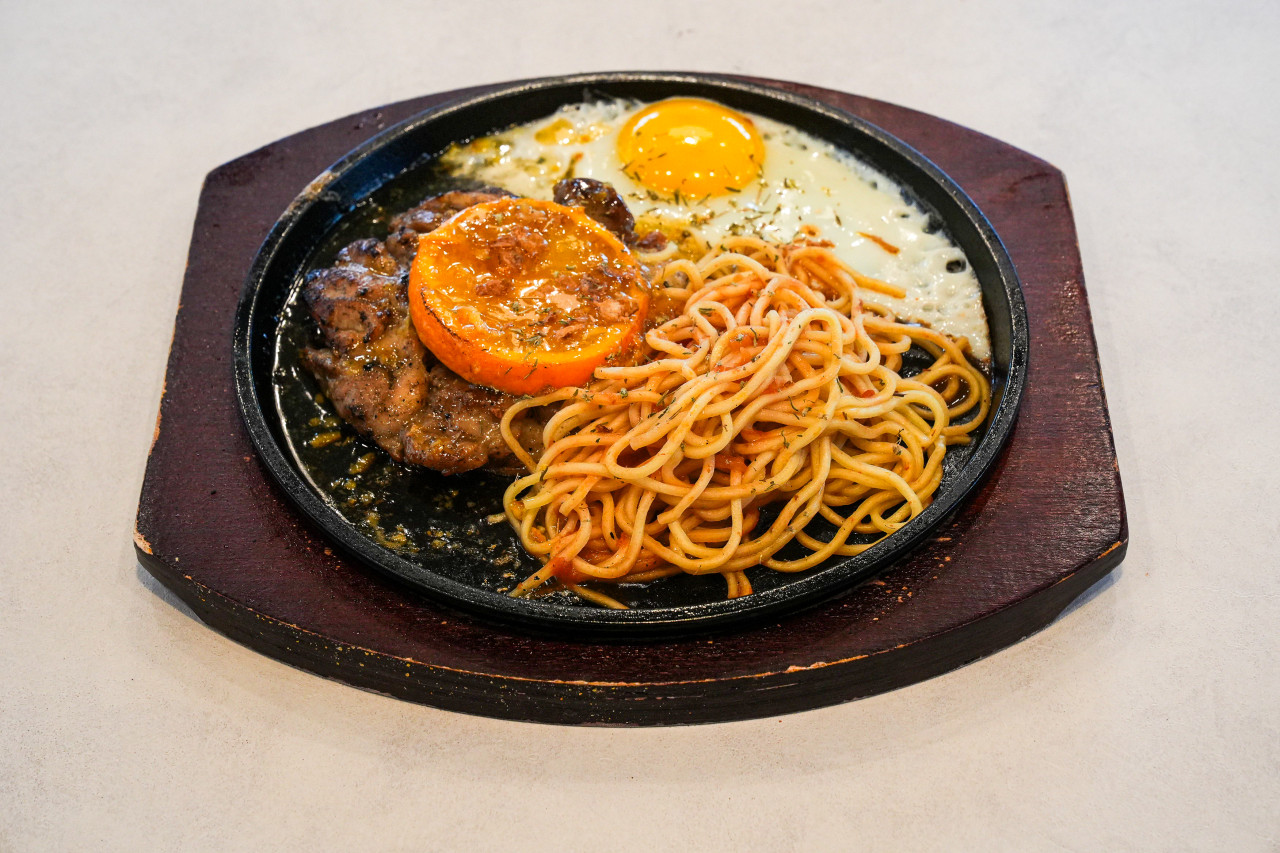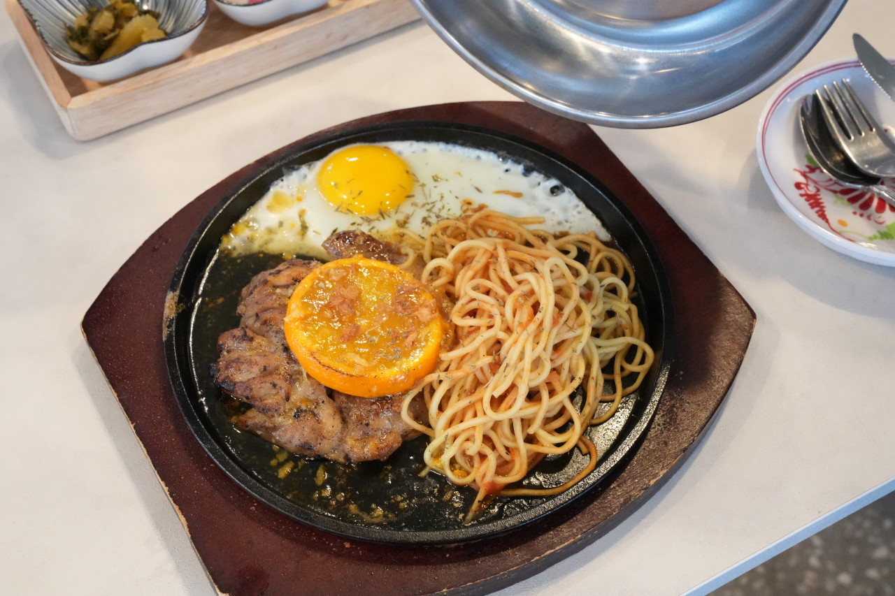 철판 위에서 제공되는 등심 스테이크는 중화면과 계란 프라이가 함께 나와 한 접시로도 충분한 식사 구성을 이룹니다. 송산106대만스테이크가 가성비 스테이크로 평가받는 이유이기도 합니다.