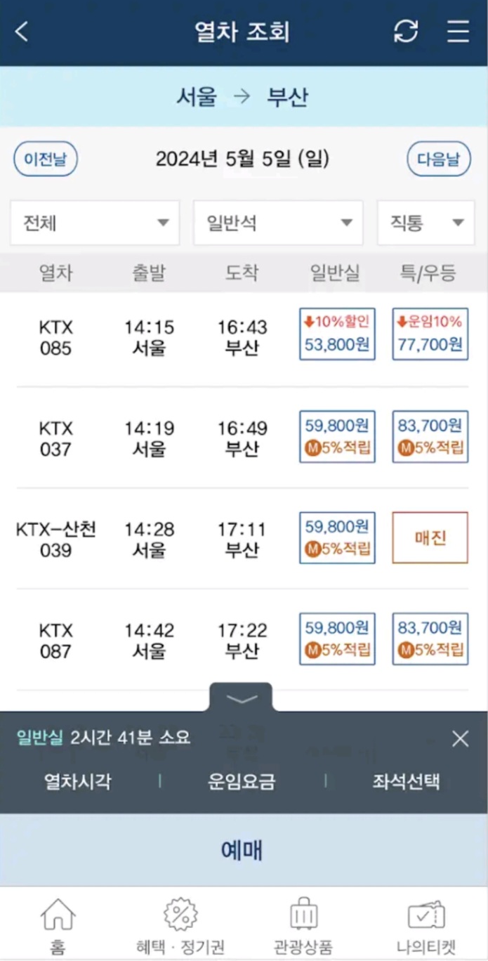 - 특실·일반실, 일반실 입석, 자유석 등 선택